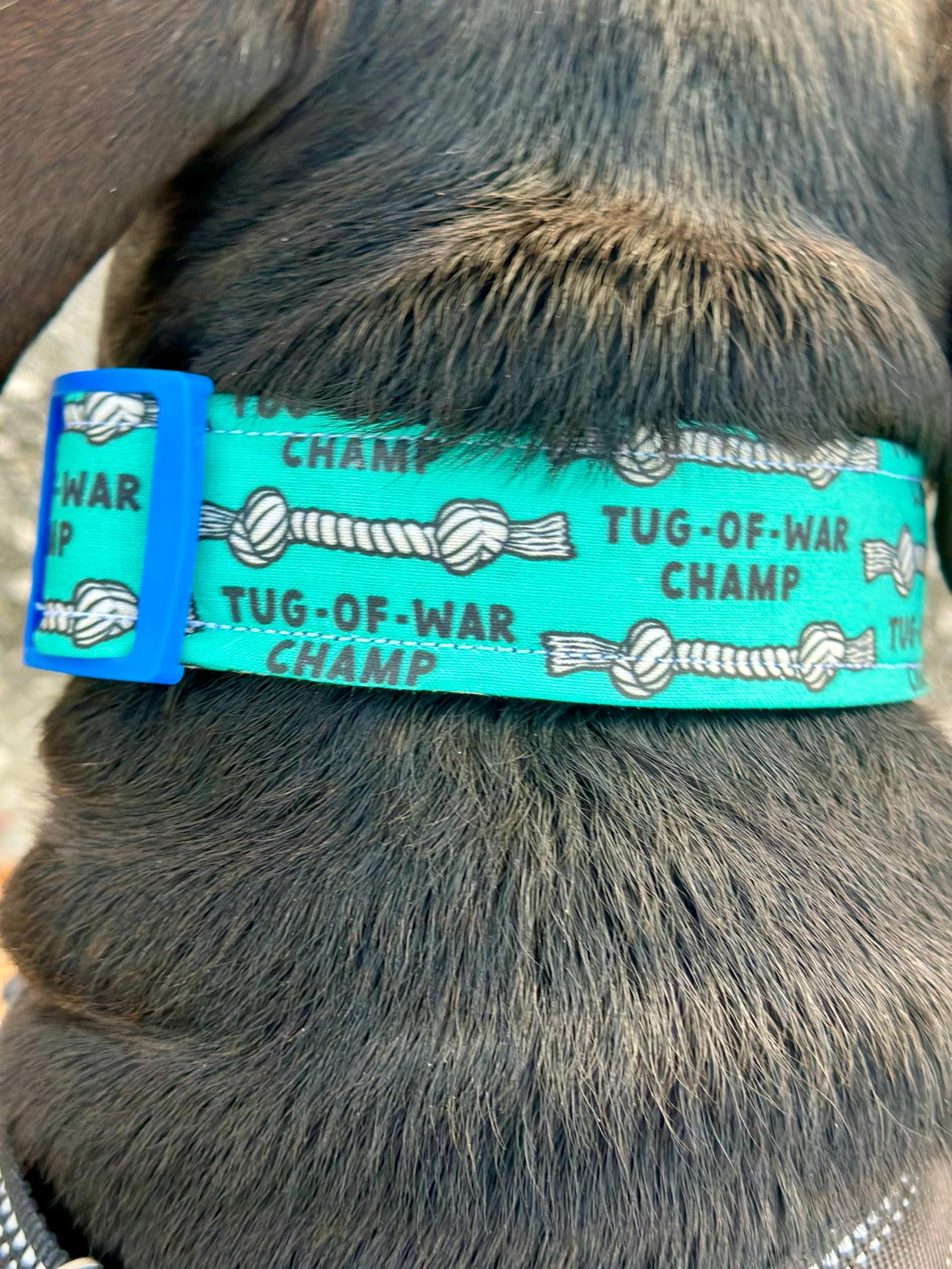 Handmade Tug of War Dog Collar: Teal Cotton, Adjustable, handmade funny dog collars, side release, washable