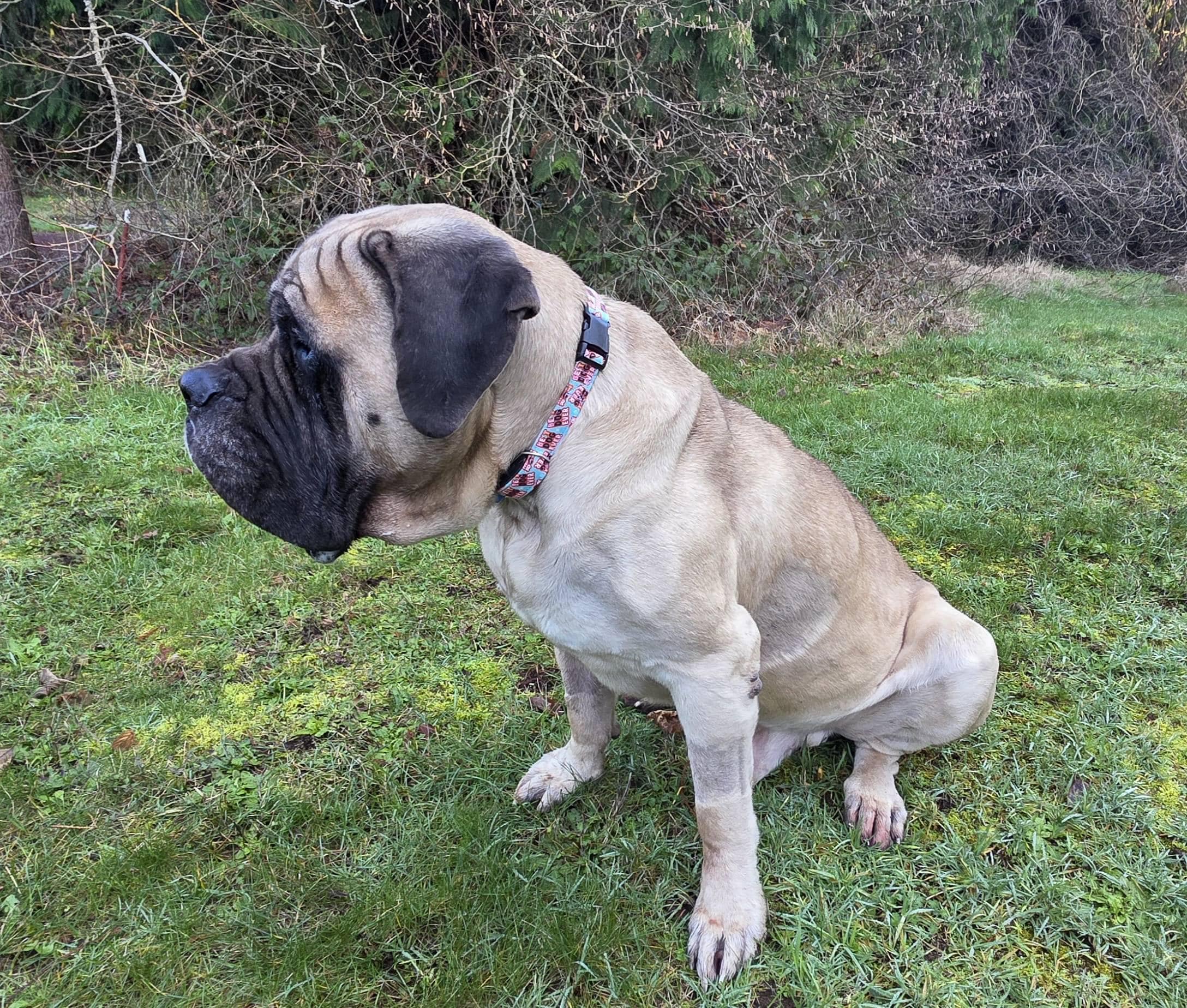 I was looking for a very specific collar for my big guy to wear with his new heart monitor on it. This meant that it needed to have minimal hardware to help keep the sensor in the proper location. It is also worn year round in all weather. I needed a collar that wouldn't trap moisture under it during the rainy season and dry fairly quickly...hence the cotton. (While biothane is great in wet weather...it also traps the moisture in that neck skin/folds.) Trixie Rox Designs didn't hesitate to customize this collar for me in a size that will fit my big guy! Frankie is rocking his Best Dog Ever collar and we are very grateful that you were willing to work with us!